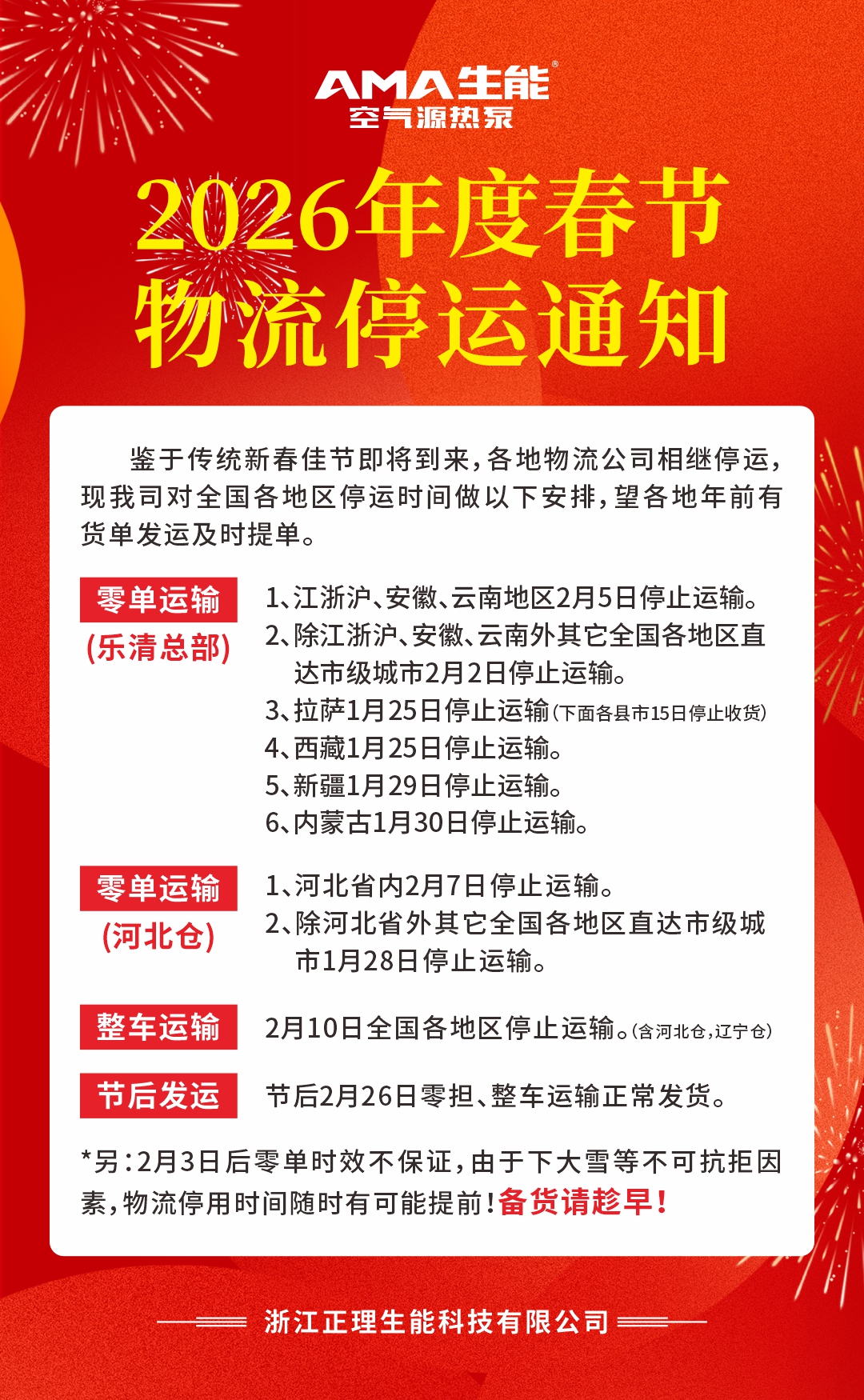 事关备货!生能 2026年度春节物流停运···